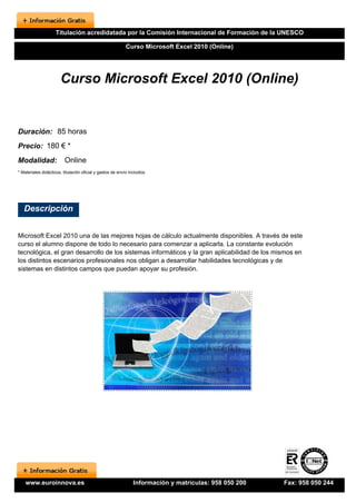 Este documento proporciona información sobre un curso en línea de 85 horas de duración sobre Microsoft Excel 2010. El curso cuesta 180 euros e incluye materiales didácticos, una titulación oficial y gastos de envío. El curso está dirigido a personas que quieran aprender a utilizar las herramientas y funcionalidades de Excel 2010 de manera completa. Al finalizar el curso, los estudiantes recibirán una titulación acreditada por la UNESCO.