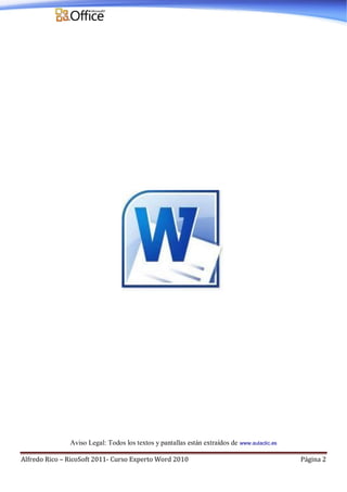 Este documento presenta un curso de 24 unidades sobre Microsoft Word 2010. Cada unidad cubre un tema diferente como crear documentos, formato, tablas, imágenes, plantillas, correo combinado, seguridad y publicación en la web. Incluye ejemplos y ejercicios paso a paso para ayudar a los estudiantes a dominar las funciones avanzadas de Word 2010.