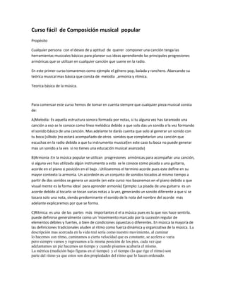 1) El documento presenta un resumen del curso "Curso fácil de Composición musical popular" que enseña las herramientas musicales básicas para componer canciones populares como pop, balada y ranchero. 2) Explica conceptos teóricos de música como melodía, armonía, ritmo y signos musicales. 3) El curso progresa desde los signos y estructuras básicas hasta aplicarlos en géneros populares.