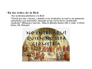 El documento discute la necesidad de un mentor para guiar el aprendizaje del estudiante, citando a Platón sobre cómo Sócrates guía al esclavo en Menón a resolver un problema geométrico mediante preguntas que lo llevan a reconocer su propia ignorancia y deseo de saber. También menciona la importancia de la literatura como Homero para la enseñanza.