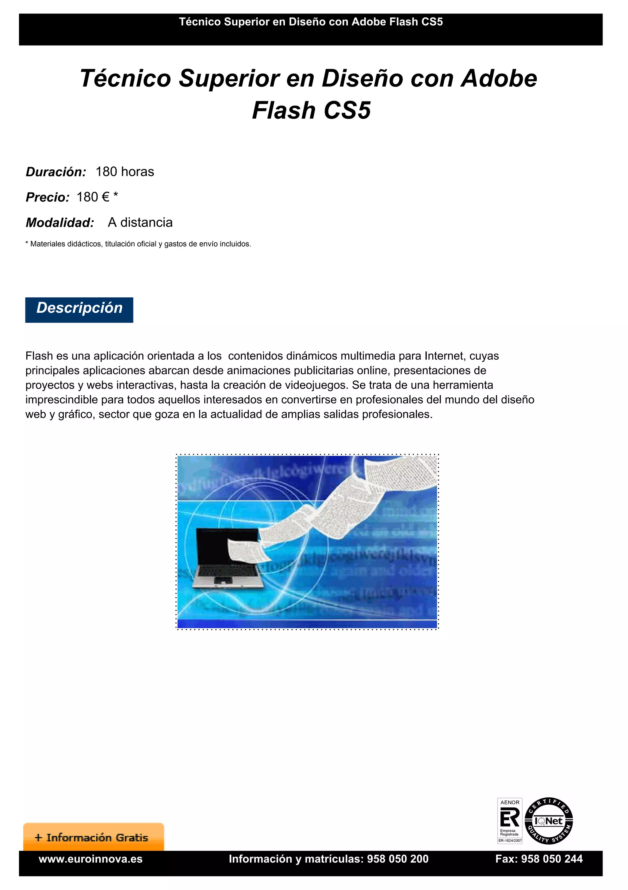 Este documento describe un curso de 180 horas de duración para obtener el título de Técnico Superior en Diseño con Adobe Flash CS5. El curso enseña a crear animaciones y contenidos interactivos para la web usando Flash. Los temas incluyen el entorno de trabajo de Flash, dibujo, objetos, color, símbolos, animación, sonido, video y publicación. El curso se imparte de forma online y el alumno recibe materiales didácticos, tutorías y una titulación oficial al completarlo con éxito.