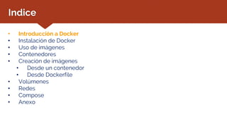 El documento es un curso básico de Docker que cubre la introducción, instalación, uso y administración de contenedores e imágenes. Explica cómo Docker permite la ejecución de aplicaciones en contenedores ligeros y portables, diferenciándose de las máquinas virtuales por su eficiencia y menor uso de recursos. Además, detalla comandos para gestionar imágenes y contenedores, así como su arquitectura y ventajas.