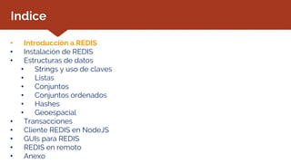 Este documento proporciona una introducción a Redis, incluyendo su instalación, estructuras de datos principales como cadenas, listas y conjuntos, y operaciones básicas. Redis es una base de datos en memoria de código abierto que ofrece altas prestaciones. Almacena datos en forma de clave-valor y soporta tipos de datos como cadenas, listas, conjuntos y hashes.