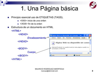 El documento proporciona una introducción al lenguaje HTML. Explica las etiquetas básicas como <HTML>, <HEAD>, <BODY>, y cómo estructurar una página web. También cubre elementos como encabezados, párrafos, listas y enlaces hypertextuales.