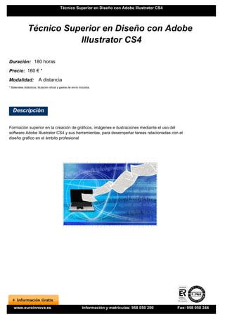 Este documento describe un curso de 180 horas de duración para obtener el título de Técnico Superior en Diseño con Adobe Illustrator CS4. El curso enseña el uso de las herramientas y funciones de Adobe Illustrator CS4 para crear gráficos, ilustraciones e imágenes profesionales. Al completar el curso, los estudiantes podrán desempeñarse en roles de diseño gráfico. El curso se ofrece de forma online y a distancia con tutoría telefónica y por correo electrónico.