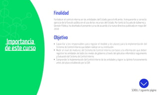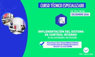 Este documento presenta la información sobre un curso técnico especializado sobre la implementación del sistema de control interno en las entidades del Estado de acuerdo a la Directiva N°013-2016-CG/GPROD de la Contraloría General de la República. El curso se llevará a cabo del 14 al 16 de diciembre de 2016 y tiene como objetivo capacitar a los responsables para implementar el sistema de control interno y medir su nivel de madurez antes del plazo establecido. El curso consta de tres módulos que cubren aspectos como la