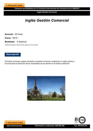 Este documento describe un curso de inglés para la gestión comercial. El curso dura 85 horas y cuesta 150 euros. Cubre temas gramaticales y vocabulario útil para el ámbito profesional. Incluye materiales didácticos como CDs y manuales. Los alumnos recibirán una titulación oficial al completar el curso con éxito.