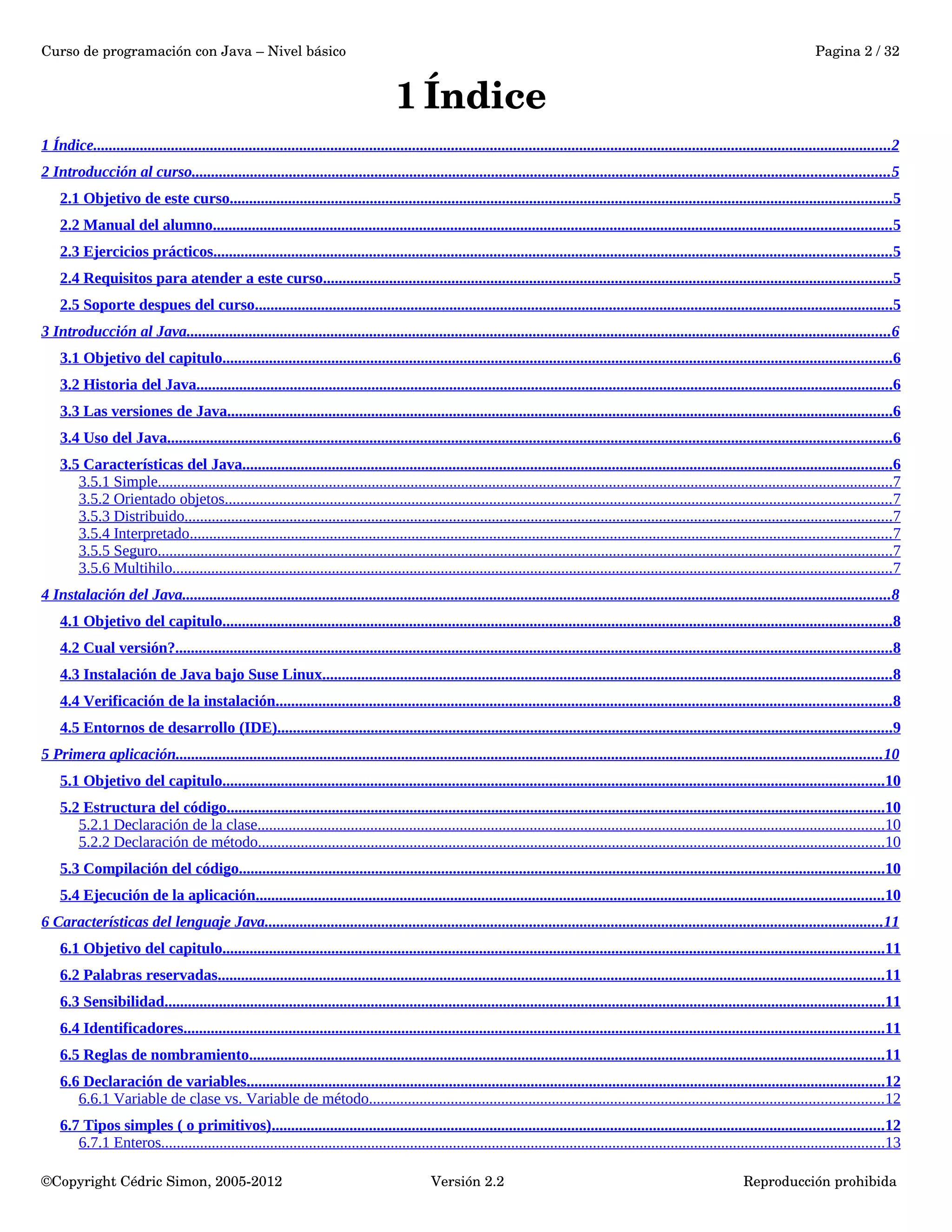 Este documento presenta un manual para un curso básico de programación con Java. Incluye un índice de contenidos, introducciones a los objetivos y requisitos del curso, y capítulos sobre la introducción a Java, la historia, versiones y características del lenguaje, e instalación del entorno de desarrollo Java. El manual provee información y guía para estudiantes que deseen aprender conceptos básicos de programación usando el lenguaje Java.