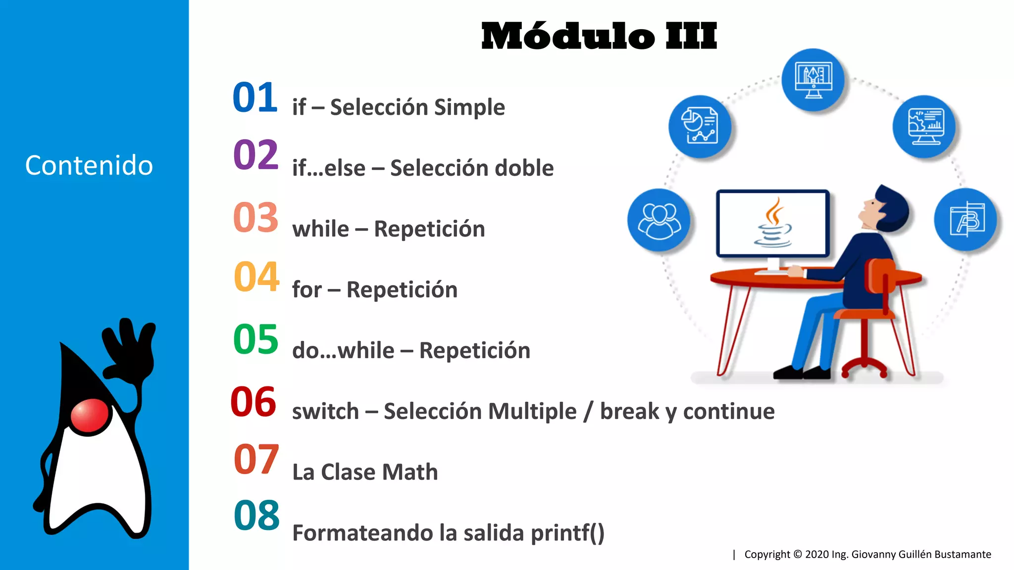 El documento es un curso de programación en Java que abarca estructuras de control como if, while, for, do...while y switch, así como el uso de la clase Math para realizar operaciones matemáticas. Se explican diferentes métodos de la clase Math, como abs(), max(), min(), y funciones trigonométricas y logarítmicas. Además, se incluye información sobre formateo de salida utilizando printf() para presentar resultados en la consola.