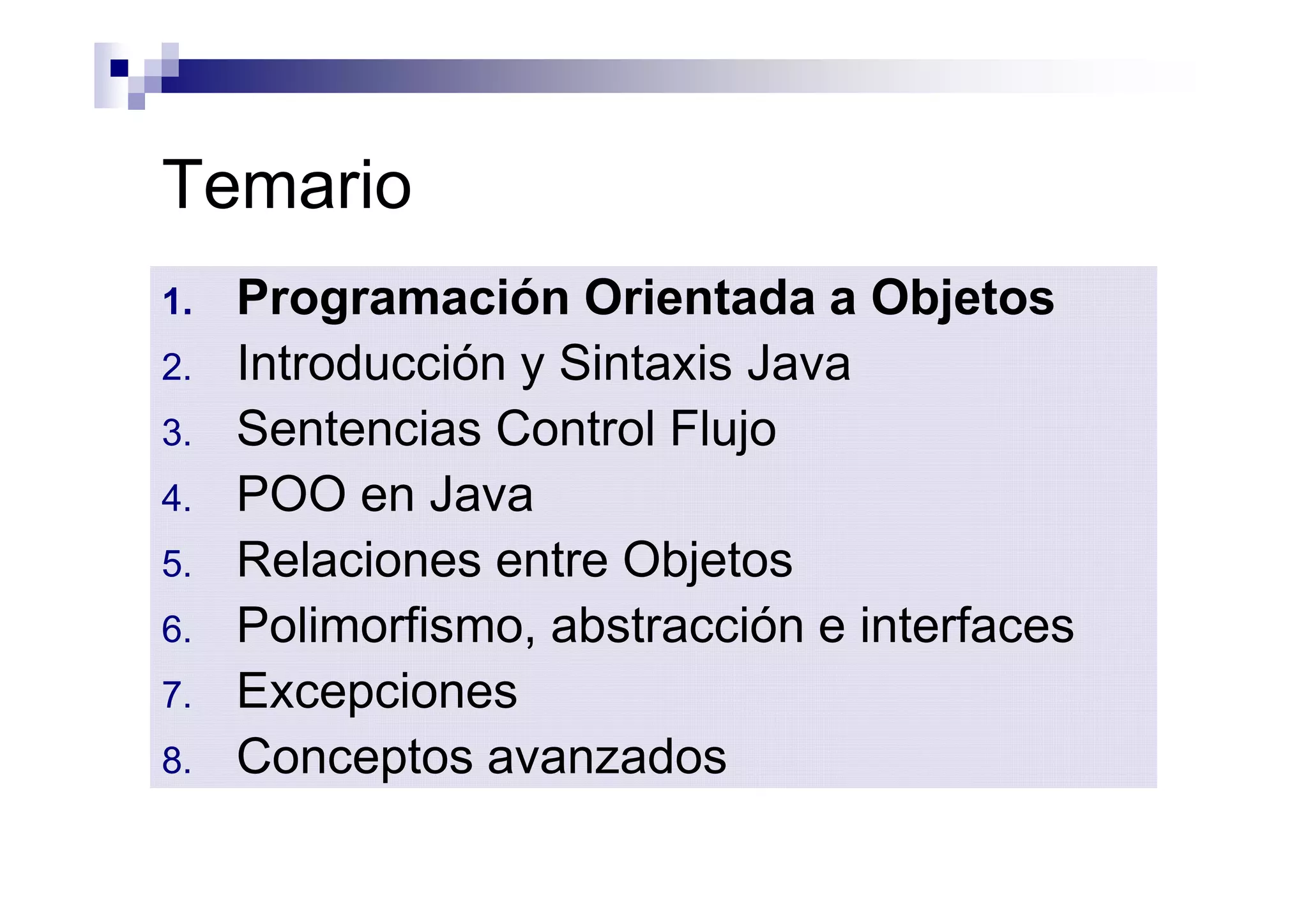 Este documento presenta el temario de un curso de Java Inicial de 20 horas. El primer tema cubre la Programación Orientada a Objetos, incluyendo su historia, características como abstracción y encapsulamiento, y elementos como clases, objetos, atributos y métodos. Los temas subsiguientes cubren introducción a Java, control de flujo, relaciones entre objetos, polimorfismo, abstracción e interfaces, y excepciones.