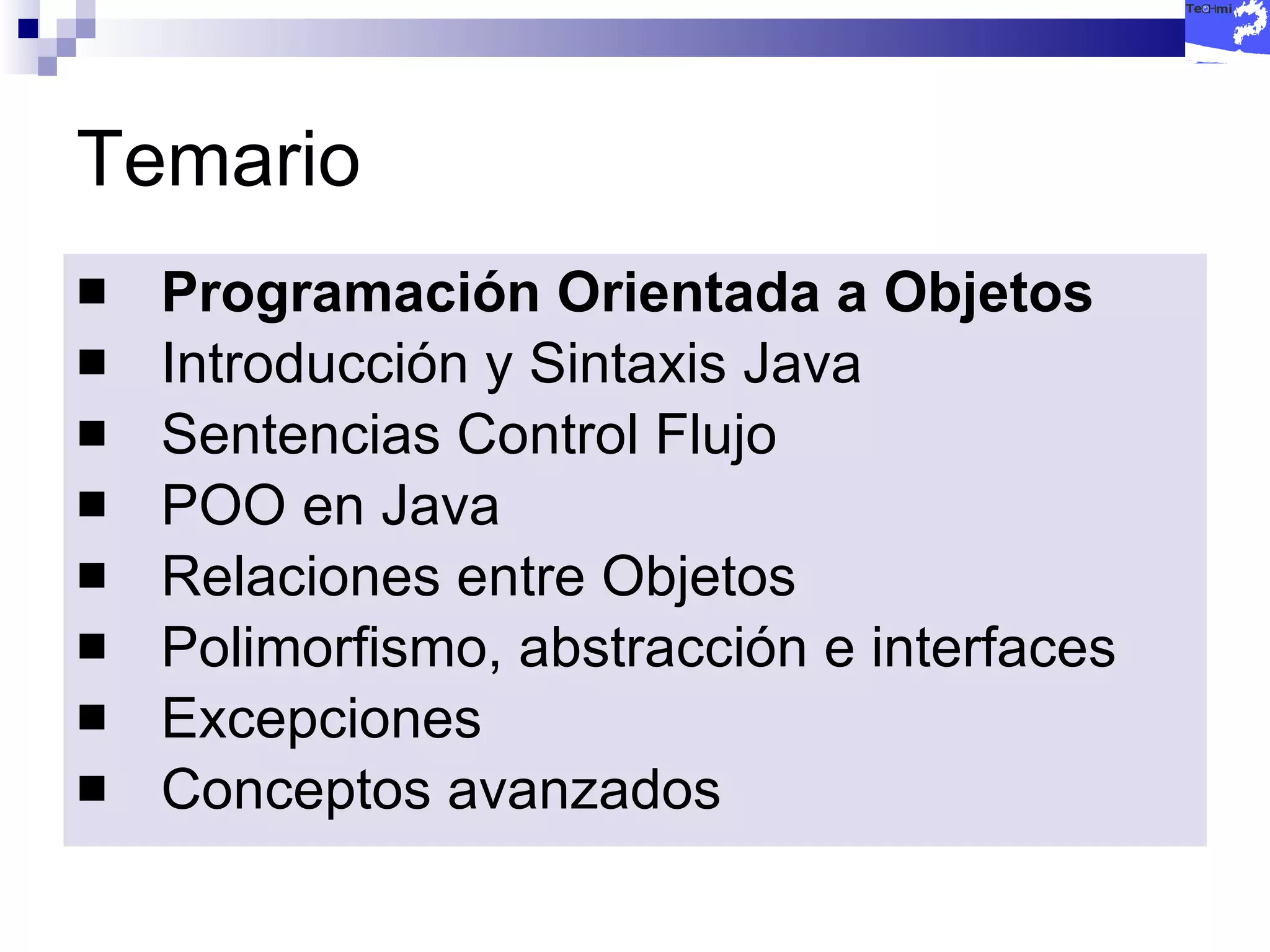 Temario Programación Orientadaa Objetos Introducción y Sintaxis Java Sentencias Control Flujo POO en Java Relaciones entre Objetos Polimorfismo, abstracción e interfaces Excepciones Conceptos avanzados