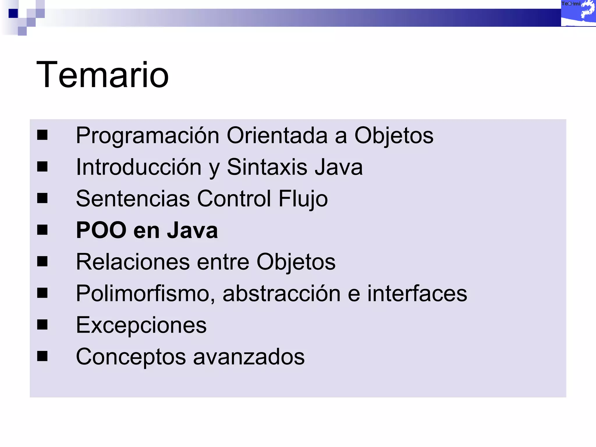 El documento presenta un temario sobre programación orientada a objetos en Java. Explica conceptos clave como clases, objetos, atributos, métodos, constructores, herencia, encapsulamiento, abstracción y polimorfismo. Detalla la estructura básica de una clase en Java, la declaración de atributos y métodos, y cómo crear y manipular objetos.