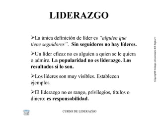 El documento habla sobre los conceptos clave del liderazgo como definición, funciones, estilos y rasgos de los líderes. También cubre temas como la motivación, comunicación, manejo de conflictos, autoridad vs poder, y teorías sobre la personalidad y motivación de los líderes.