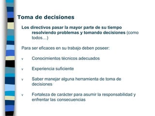 Este documento presenta información sobre liderazgo y dirección docente. Explica cuatro estilos de dirección (patronal, paternalista, participativo y permisivo) y analiza sus comportamientos eficaces e ineficaces. También describe diferentes teorías sobre el liderazgo, incluyendo teorías sobre rasgos de personalidad, conducta, situacionales e interactivas. El documento proporciona una visión general del liderazgo y la dirección en entornos educativos.