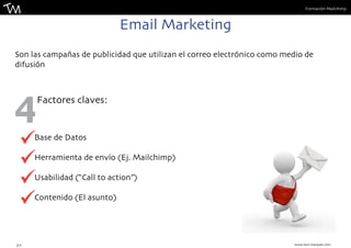 El documento proporciona información sobre el uso de Mailchimp para campañas de email marketing. Explica que el email marketing utiliza el correo electrónico como medio de publicidad y destaca cuatro factores claves: base de datos, herramienta de envío, usabilidad y contenido. A continuación, describe los pasos para crear una cuenta en Mailchimp, una lista de contactos y una campaña, incluyendo la edición de contenido, imágenes y enlaces. Finalmente, menciona consideraciones legales relacionadas con la privacidad de datos y el spam.