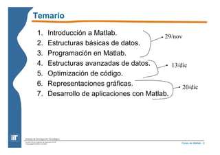 Este documento presenta un curso rápido de Matlab. El curso consta de 7 temas principales: introducción a Matlab, estructuras básicas de datos, programación en Matlab, estructuras avanzadas de datos, optimización de código, representaciones gráficas y desarrollo de aplicaciones con Matlab. Se detallan los contenidos de cada tema y se proporcionan ejemplos para ilustrar conceptos como variables, vectores, matrices y operaciones en Matlab.