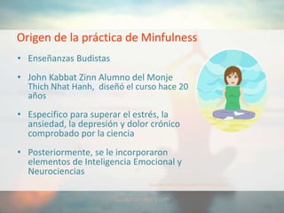 El documento explora la práctica del mindfulness, originada en enseñanzas budistas y popularizada por Jon Kabat-Zinn, como una herramienta efectiva para gestionar el estrés, la ansiedad y la depresión mediante la atención plena. Resalta la necesidad de cuidar nuestra salud mental en un mundo cada vez más estresante y presenta evidencias científicas que respaldan sus beneficios para el bienestar emocional y cognitivo. El curso de mindfulness propuesto incluye prácticas como la meditación y la atención consciente en diversas interacciones diarias para mejorar la calidad de vida y las relaciones interpersonales.