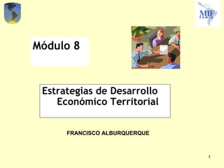 El documento describe la importancia de elaborar estrategias de desarrollo económico territorial (DET) que involucren la movilización de actores locales y fomenten el diálogo público-privado para crear una visión compartida y aprovechar las oportunidades del territorio. Además, se destaca el papel de las agencias de desarrollo territorial como intermediarias que maximizan el potencial económico local y pueden brindar apoyo a mipymes a través de servicios de formación y recursos. Por último, se enfatiza la necesidad de un enfoque sustentable en el desarrollo rural, optimizando el uso de recursos naturales y promoviendo la innovación para mejorar la competitividad.