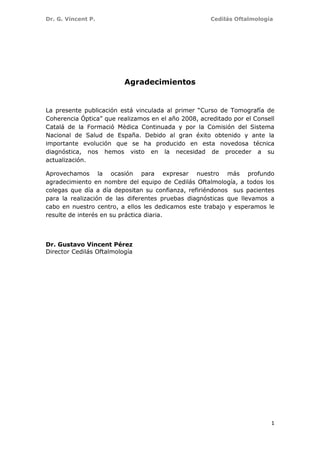 Este documento proporciona una introducción a la tomografía de coherencia óptica (OCT) y describe su utilidad para diagnosticar varias patologías oculares como el edema macular. Explica los principios de la OCT de dominio espectral y muestra imágenes de una retina normal identificando sus capas. Luego se enfoca en describir el edema macular, sus causas y cómo se ve en una OCT.