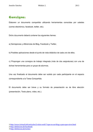 El documento define blogs, Facebook y Twitter, y compara sus semejanzas y diferencias. Luego discute posibles aplicaciones didácticas como aulas virtuales, y propone una actividad integrada entre asignaturas usando una de las plataformas. La actividad involucra a estudiantes buscando información en línea relacionada a las estaciones del año y compartiendo sus hallazgos en Facebook.