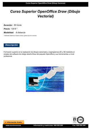 Este curso enseña el uso avanzado del programa de dibujo vectorial OpenOffice Draw. El curso dura 85 horas y cuesta 120 euros. Cubre temas como crear formas básicas, manipular objetos, trabajar con texto e imprimir documentos. Al completar el curso, los estudiantes reciben una certificación oficial expedida por la UNESCO.