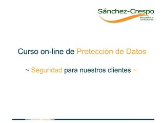 Este documento describe un curso en línea sobre protección de datos ofrecido por Sánchez-Crespo Abogados y Consultores. La protección de datos es ahora una obligación empresarial. Un curso en línea ofrece flexibilidad, ahorra costos al evitar depender de horarios, y se adapta a las necesidades específicas de cada empresa. Sánchez-Crespo Abogados y Consultores garantiza la calidad del curso debido a su experiencia en este campo y enfoque en la formación.