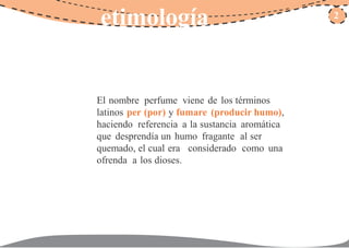 El documento trata sobre un curso de perfumería para vendedores. Explica brevemente la etimología del término "perfume", la historia del uso de perfumes en culturas antiguas como la India, Egipto y Grecia, y los componentes principales de un perfume como el alcohol etílico, las esencias aromáticas y los fijadores. También describe el proceso de extracción de aceites esenciales y los diferentes métodos como la destilación y la maceración.