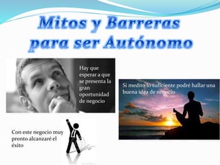 El documento presenta información sobre el emprendimiento. Aborda temas como las ventajas e inconvenientes de ser emprendedor, cómo dar forma a una idea de negocio, errores que se deben evitar, y aspectos a considerar en el plan de negocio como el análisis DAFO, recursos humanos, y previsiones financieras.