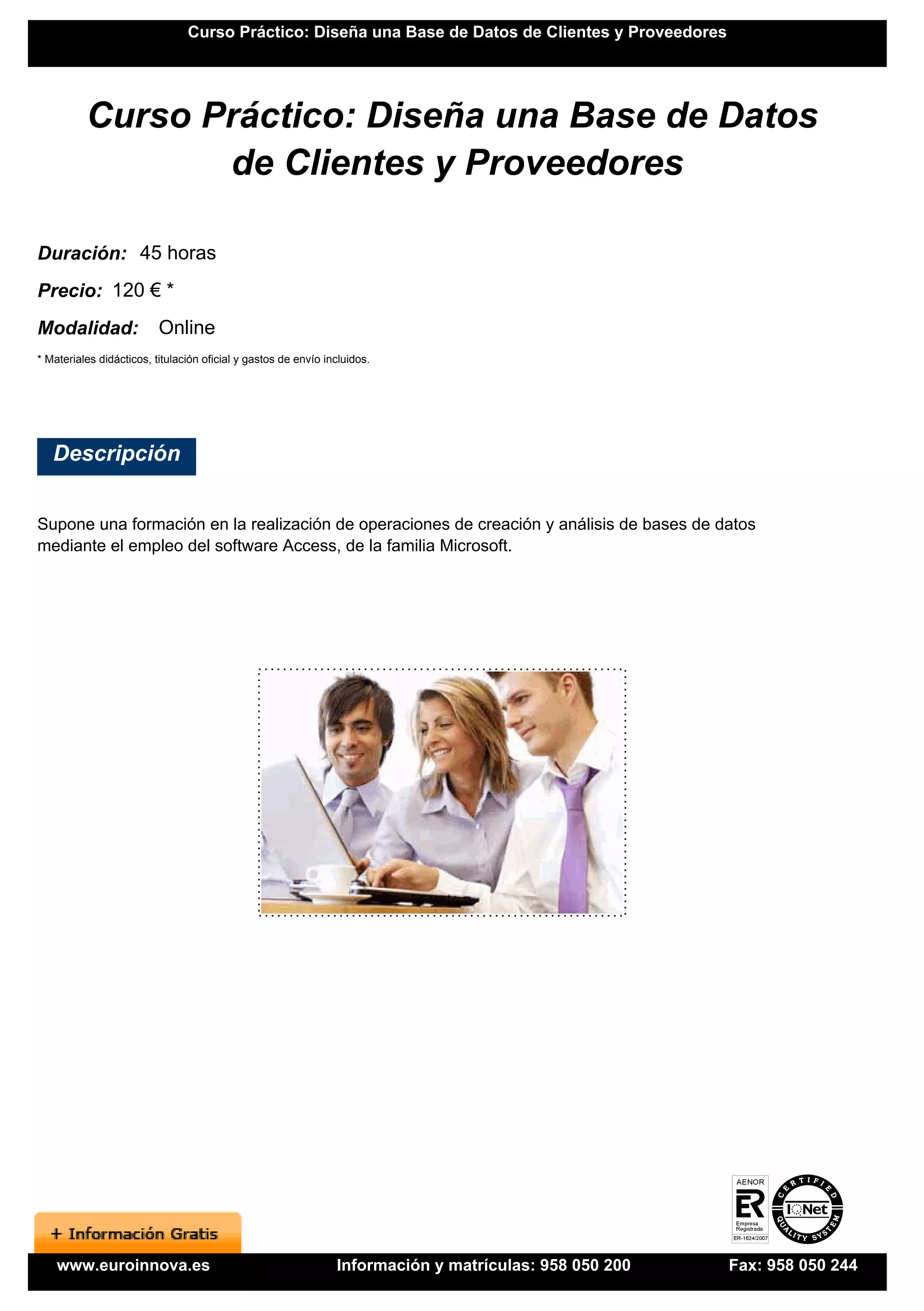 Este documento describe un curso práctico de 45 horas de duración sobre el diseño de bases de datos de clientes y proveedores utilizando Microsoft Access. El curso enseña a analizar, diseñar y gestionar bases de datos, y a crear informes y formularios. Está dirigido a personas sin experiencia previa que deseen aprender estas habilidades. Al completar el curso satisfactoriamente, los estudiantes recibirán una titulación oficial acreditada por la UNESCO.