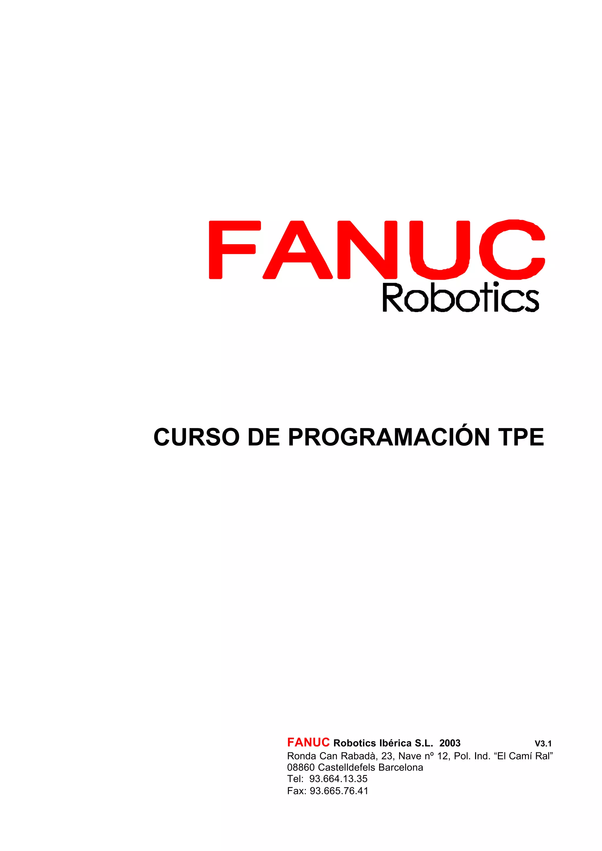 Este documento proporciona información sobre la seguridad, tipos de unidades mecánicas, descripción del controlador y teach pendant de un robot FANUC. Describe los diferentes modos de movimiento del robot, ajuste de límites, creación de trayectorias y configuración de herramientas. También cubre temas avanzados como entrada/salida, gestión de archivos, masterización y códigos de error. El documento es un manual completo para la operación y programación segura de un robot FANUC.