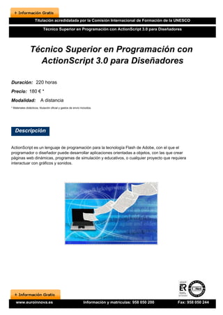 Este documento describe un curso de programación en ActionScript 3.0 para diseñadores. El curso dura 220 horas y cuesta 180 euros. Enseña a programar usando ActionScript 3.0 para crear proyectos interactivos y dinámicos en Flash. Al completar el curso, los estudiantes recibirán una titulación oficial y estarán capacitados para trabajar en diseño web, gráfico y programación. El curso se imparte de forma online y los estudiantes recibirán materiales didácticos, tutorías y apoyo.