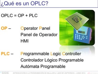 El documento es un curso introductorio sobre la programación de micro-PLCs Jazz de Unitronics, que abarca conceptos básicos como la definición de OPLC, entradas y salidas, y programación en lenguaje Ladder. Se presentan ejemplos prácticos de programación, así como las funciones del micro-PLC, incluyendo temporizadores, operaciones matemáticas y control PID. También se detalla la comunicación y configuración del dispositivo, destacando las ventajas del uso de PLCs en automatización industrial.