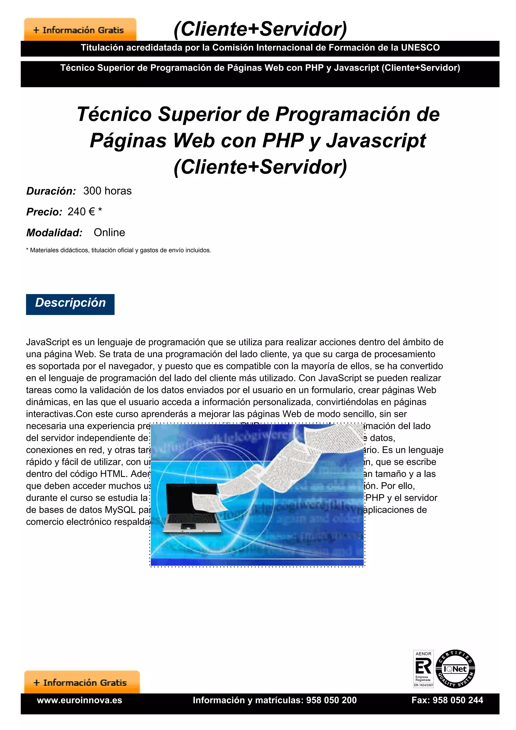 Este documento describe un curso de programación de páginas web con PHP y JavaScript. El curso dura 300 horas y cuesta 240 euros. Enseña a programar en JavaScript para dar funcionalidad al lado del cliente y PHP para el lado del servidor. Incluye temas como variables, funciones, objetos, bases de datos, formularios y desarrollo de aplicaciones completas como un sistema de comercio electrónico. Al finalizar el curso se otorga una titulación oficial.