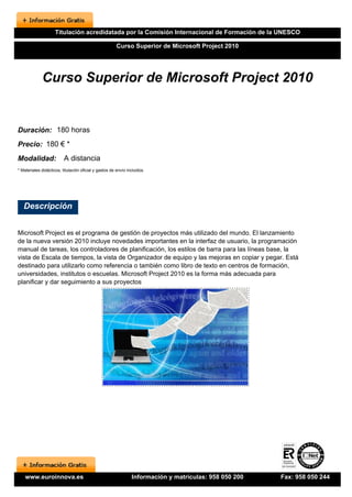 El documento describe un curso superior de Microsoft Project 2010 de 180 horas de duración. El curso enseña el uso avanzado del programa de gestión de proyectos Microsoft Project 2010 y cómo planificar y dar seguimiento a proyectos. El curso incluye materiales didácticos como un manual, cuaderno de ejercicios y CD multimedia. Al completar el curso con éxito, los estudiantes reciben una titulación acreditada por la UNESCO.