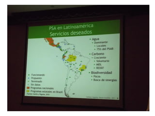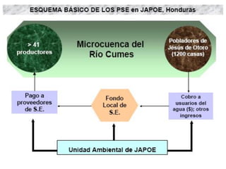 Este documento presenta conceptos y metodologías relacionadas con los pagos por servicios ambientales (PSA). Explica que los PSA involucran pagos a propietarios de tierras para que mantengan o modifiquen usos del suelo que afectan la disponibilidad o calidad de un recurso. También describe los pasos generales para implementar un sistema de PSA, incluido el estudio de factibilidad, diseño del proyecto, ejecución, y monitoreo y evaluación continua. Además, analiza conceptos clave como derechos