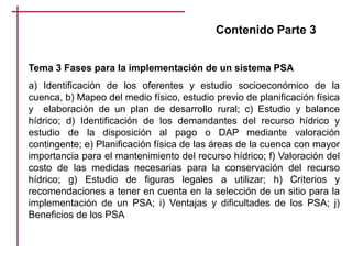 Este documento describe las fases para la implementación de un sistema de pagos por servicios ambientales (PSA), incluyendo la identificación de oferentes y demandantes, el mapeo del medio físico, los estudios de balance hídrico, la valoración del costo de medidas de conservación, y el estudio de figuras legales. También discute criterios para seleccionar un sitio piloto, ventajas y desafíos de los PSA, y beneficios potenciales como la reducción de conflictos y la generación de empleo sostenible.