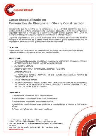 CESAP ofrece un curso especializado de 20 horas sobre prevención de riesgos en obra y construcción, basado en el nuevo reglamento de seguridad y salud en el trabajo para el sector construcción. El curso se dictará los días 1 y 8 de septiembre en modalidad presencial y virtual en la sede de San Isidro, y estará a cargo del Ingeniero José Luis Ruiz Rivera.