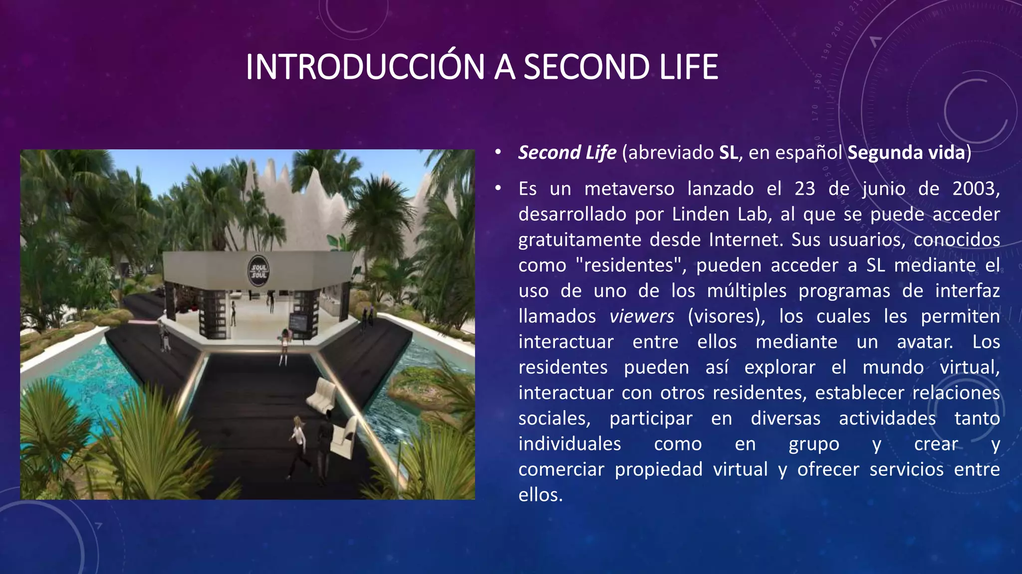 El documento presenta un curso sobre el uso de Second Life, un metaverso accesible en línea desde 2003, donde los usuarios, conocidos como 'residentes', interactúan a través de avatares. Se describen los requisitos del sistema para descargar el programa, así como instrucciones para crear una cuenta y seleccionar un avatar. Además, se anticipa el contenido del siguiente módulo, que se centrará en la personalización y movilidad del avatar.