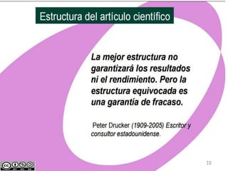 El documento aborda la redacción de artículos científicos, incluyendo tipos y estructura, proceso de publicación y aspectos éticos relacionados con el plagio. Destaca la importancia de comunicar resultados de investigación de manera clara y precisa y describe componentes esenciales como título, resumen e introducción. Se enfatiza la necesidad de seguir principios de claridad, precisión y concisión en la redacción científica.