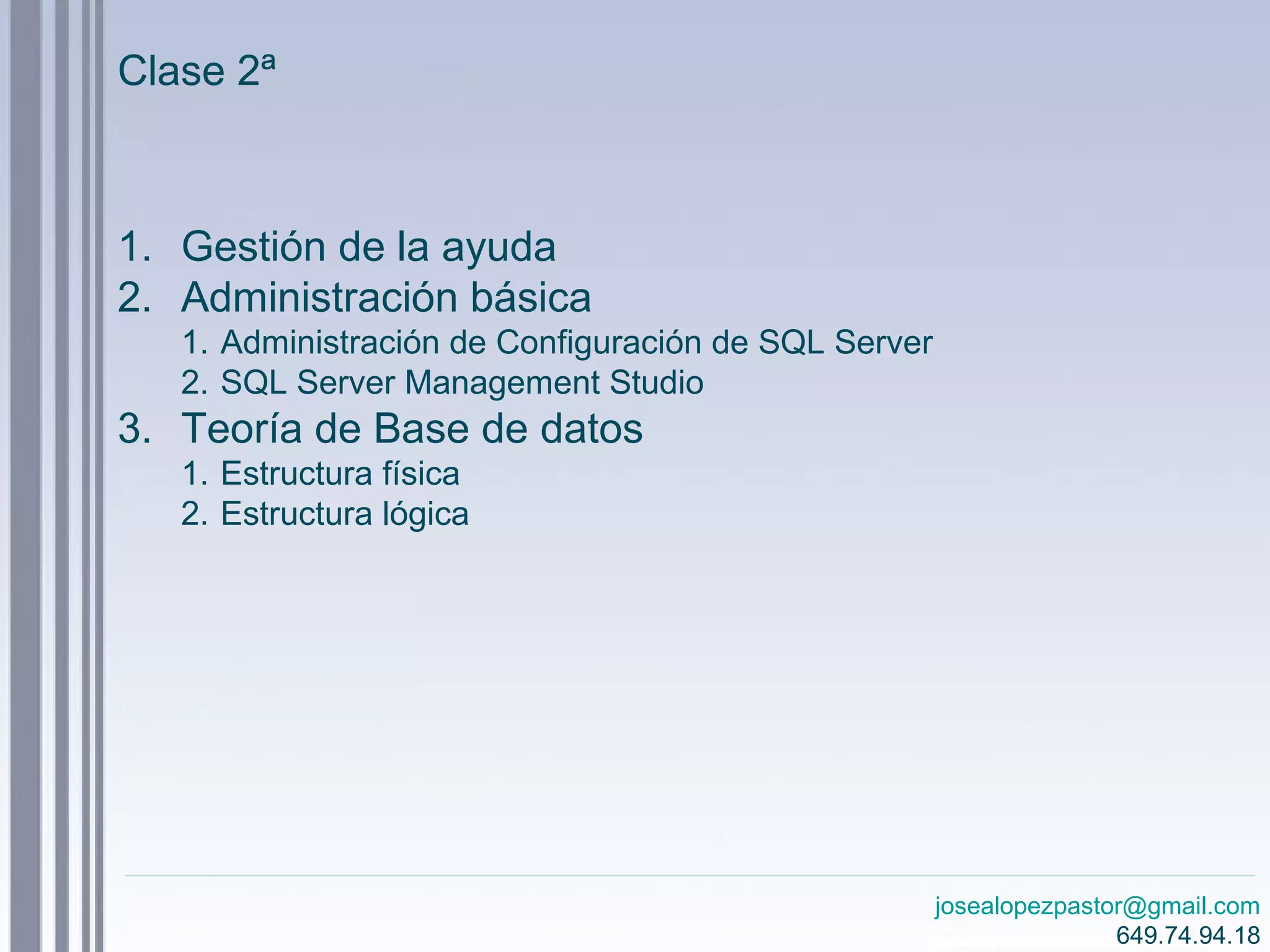 Este documento contiene información sobre la administración y configuración de SQL Server. Explica los diferentes servicios de SQL Server como SQL Server, SQL Server Agent e Integration Services y cómo configurarlos. También describe las herramientas SQL Server Management Studio y SQL Server Configuration Manager y cómo se usan para administrar instancias de SQL Server de forma local y remota. Por último, resume conceptos básicos de bases de datos como la estructura física y lógica.