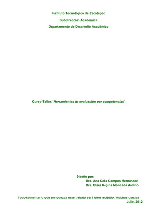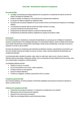 Este documento presenta el diseño de un curso-taller llamado "Herramientas de evaluación por competencias" dirigido a docentes del Instituto Tecnológico de Zacatepec. El curso se enfoca en enseñar a los docentes cómo utilizar diferentes herramientas de evaluación para evaluar el aprendizaje basado en competencias. El curso dura 30 horas y cubre temas como los conceptos de evaluación, los instrumentos de evaluación por competencias, y cómo diseñar estrategias didácticas que incorporen estas herramientas de evalu