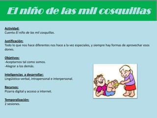 Este documento describe una actividad basada en el cuento "El niño de las mil cosquillas" para trabajar la aceptación personal y la capacidad de alegrar a los demás. La actividad se llevará a cabo en dos sesiones e involucrará la lectura del cuento, preguntas de comprensión, discusión sobre las fortalezas personales y una dramatización para evaluar la expresión oral y corporal.