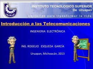 Este documento presenta un curso de Introducción a las Telecomunicaciones. El objetivo general del curso es que los estudiantes comprendan los fundamentos para operar sistemas de comunicaciones electrónicas y conozcan protocolos y medios de transmisión de señales basados en normas oficiales. El curso cubrirá 9 unidades temáticas e incluirá exámenes escritos, prácticas de laboratorio, tareas e investigación y un proyecto final para la evaluación.