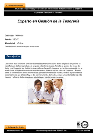 Este documento describe un curso en línea de 90 horas de duración sobre Gestión de la Tesorería. El curso cuesta 150 euros e incluye materiales didácticos, una titulación oficial y gastos de envío. El curso enseña sobre instrumentos financieros, gestión de riesgos, previsiones de tesorería y programas de gestión de tesorería. Al finalizar, los estudiantes podrán gestionar y controlar la tesorería y presupuesto de una empresa. El curso se imparte en línea con tutorías telefónicas y por cor
