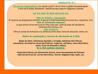 El documento describe diferentes tipos de tecnologías de la información y comunicación (TIC) que pueden utilizarse para mejorar los procesos de aprendizaje, incluyendo entornos hipermediáticos, tipos de páginas web educativas, y medios de comunicación e información disponibles en Internet. También analiza la diferencia entre la Web 1.0 unidireccional y la Web 2.0 bidireccional, que permite a los usuarios participar y contribuir a la inteligencia colectiva a través de blogs, wikis y redes sociales.