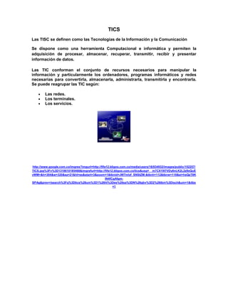 Las Tecnologías de la Información y Comunicación (TIC) incluyen dispositivos como faxes, modems, impresoras, escáneres, redes alámbricas, videoconferencia, video proyectores y dispositivos de almacenamiento que permiten la adquisición, procesamiento, almacenamiento, transmisión y presentación de información.