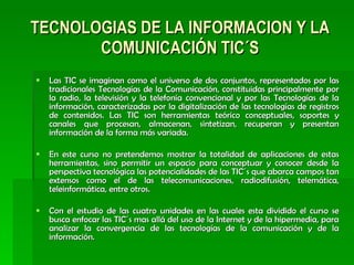El documento presenta un curso sobre tecnologías de la información y la comunicación (TIC) dividido en 4 unidades. La primera unidad analiza la sociedad de la información y el conocimiento. La segunda cubre los medios de información y comunicación, la brecha digital y la convergencia. La tercera trata sobre las aplicaciones educativas y culturales de las TIC y el e-learning. La cuarta explora las tecnologías de televisión como la telefonía VoIP y servicios interactivos multimedia.