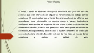 Este documento presenta un taller sobre el desarrollo de la inteligencia emocional. El objetivo general es desarrollar la capacidad de gestionar las emociones a través de herramientas que permitan el bienestar psicológico y las relaciones interpersonales. El taller consta de cinco sesiones que abarcan temas como la definición de emociones, tipos de emociones, el sistema límbico, estrategias de autogestión emocional y actividades prácticas para identificar emociones y creencias limitantes.