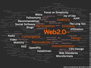 El documento explora la evolución de la web desde la web 1.0, centrada en el comercio, hacia la web 2.0, que enfatiza la interacción social y la participación del usuario. Se detallan tecnologías clave como AJAX, RSS y mashups, que han democratizado la creación de contenido y mejorado la usabilidad. Además, se presentan oportunidades de negocio emergentes a partir de estas innovaciones en la red.