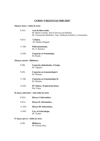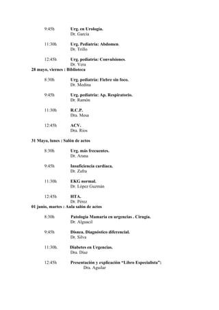 Este documento presenta el programa de un curso sobre urgencias médicas que se llevará a cabo del 24 de mayo al 4 de junio. El curso cubrirá diversos temas relacionados con urgencias en diferentes especialidades médicas a través de conferencias dictadas por distintos doctores en diferentes salones y aulas los días laborables de la semana.